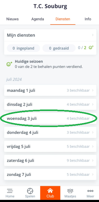 - Klik onderaan op ‘Club’ en daarna bovenaan op ‘Diensten’ .