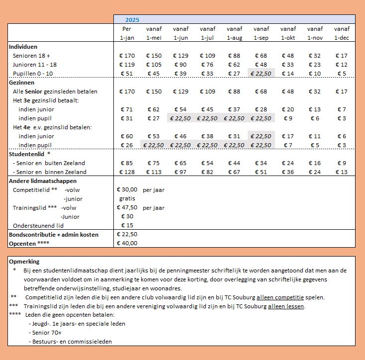 Het contributiejaar loopt van 1 januari t/m 31 december. Leden van TC Souburg dienen volgens het huishoudelijk reglement hun contributie te voldoen voor 16 maart van het betreffende contributiejaar. Medio februari/maart ontvangt ieder lid daartoe een gespecificeerde nota. Wie betaald heeft krijgt daardoor het recht op een (digitale)spelerspasje en kan via de KNLTB clubapp een baan reserveren.