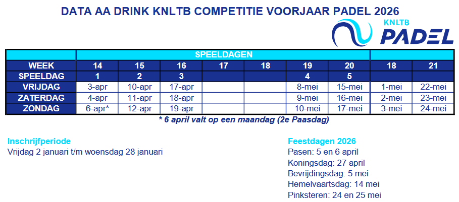 De speeldata voor de PADEL Voorjaarscompetitie 2026 zijn: